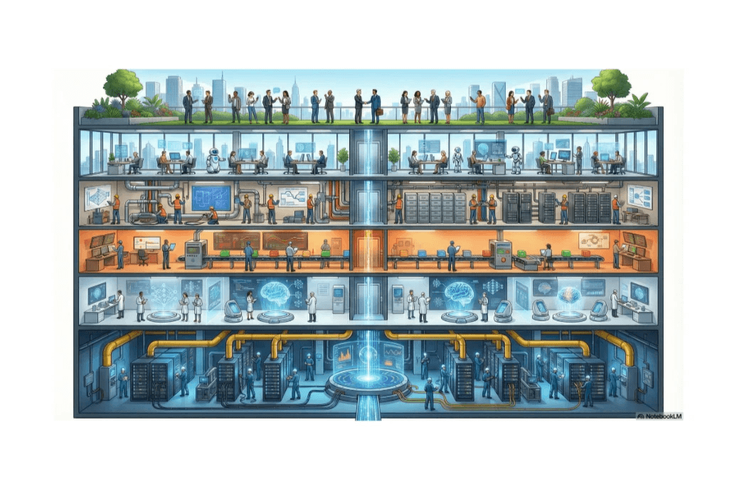 Every level of the cake relies on the foundation below it to support the people and businesses at the top. Bottom layers sell technology up to the software makers, while the customers at the top send money and usage data back down to improve the system.